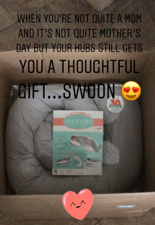 The Snoogle pillow has now replaced the heating pad as my BFF (see picture below if you’re unsure of what this is). This is a game changer and I honestly may use it all the time, pregnant or not. It’s amazing. Thanks again to my baby daddy for getting it for me as an early Mother’s Day gift. That’s another thing, I didn’t realize I could ‘officially’ celebrate Mother’s Day but apparently I can. That was a surreal feeling. Even though I guess I’m not ‘technically’ a mom, I felt very honored to be included on such a sacred and special day.