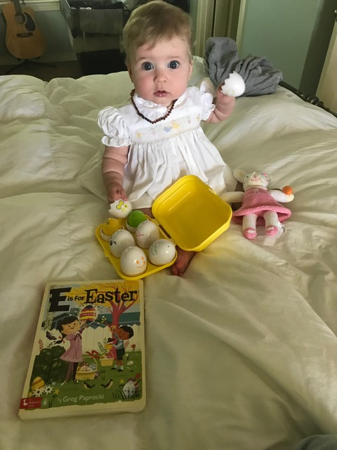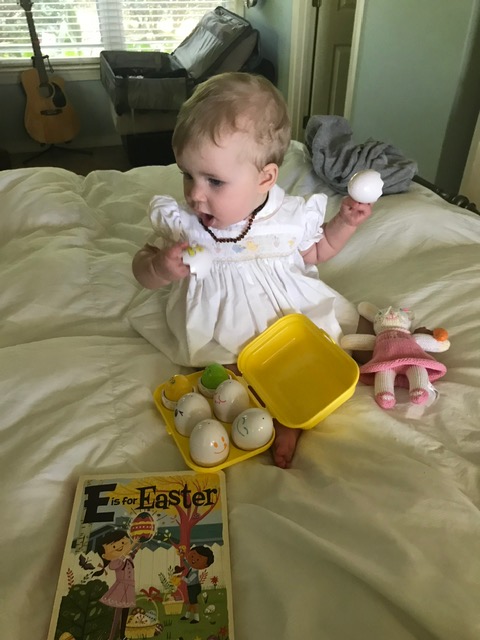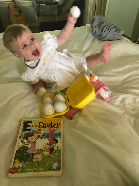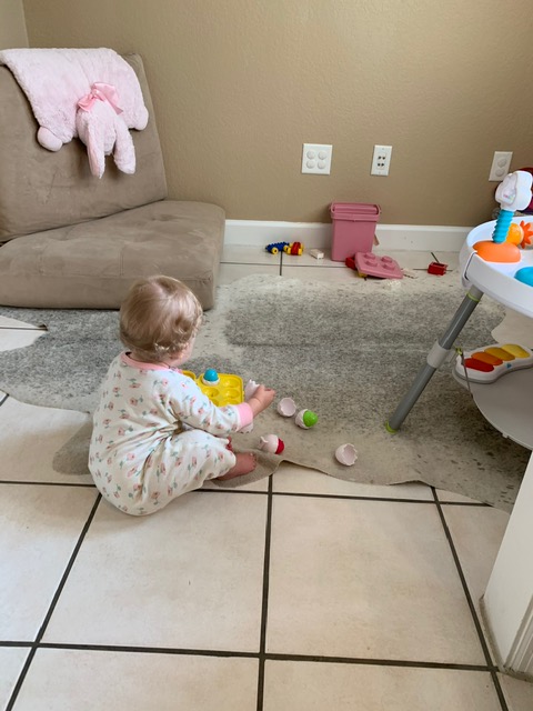It started off just being fun and Pfeiffer liked to pick them up and dump them out of their carton but now she tries to hold them so they don’t break (still likes to dump them out) and make them chirp. We’ll continue on by teaching her their shapes and colors.