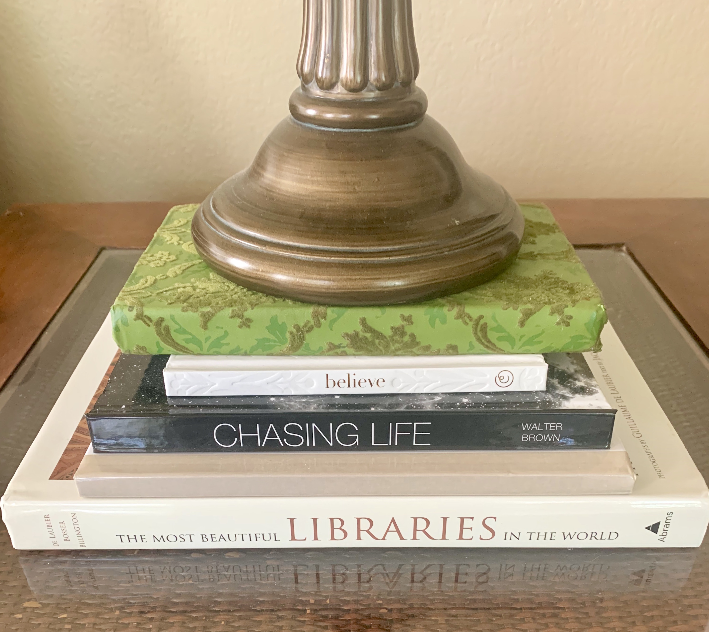 I absolutely love books and everything that goes with them: reading (duh), libraries, the smell of them (I know others would agree with me on this too), etc. and I think they are so unique to add to your decor whether they are on a shelf, coffee table, stacked like this or something else I maybe haven’t thought of! Mine are a curated collection of hand-me-downs, vintage finds, and new. This stack for example, from top to bottom is: