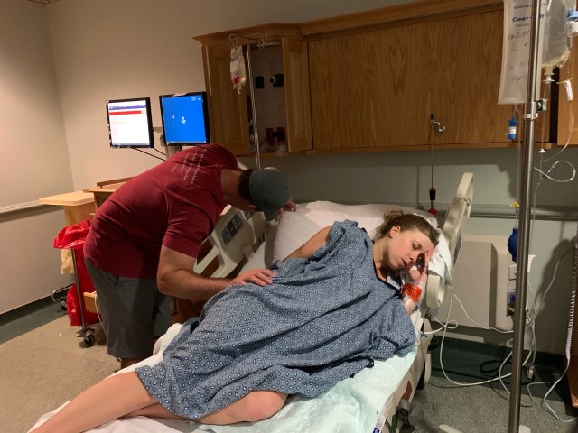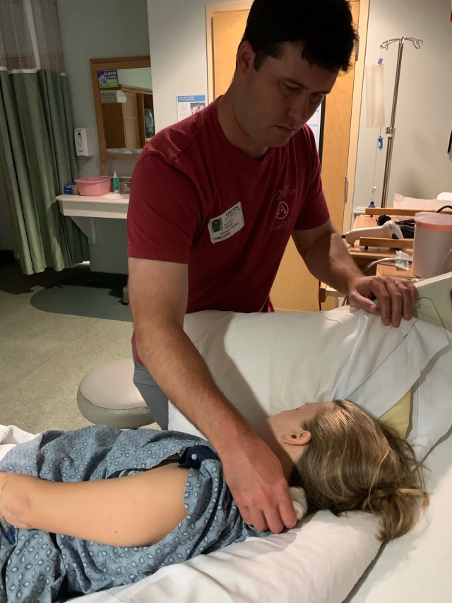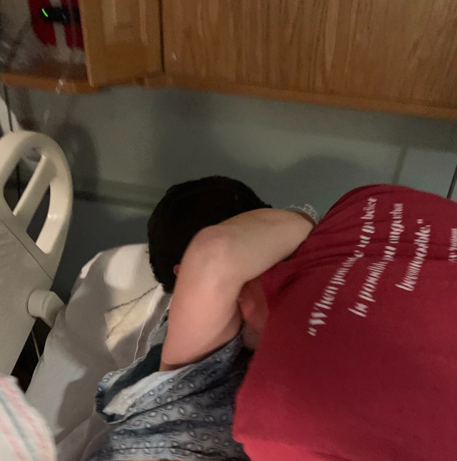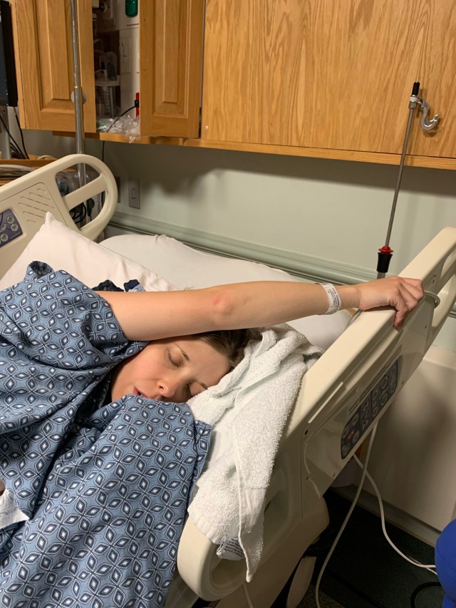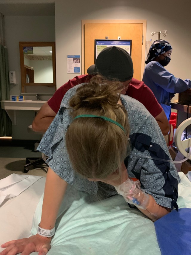- Get checked in at the hospital and taken to triage after doing a lap around the parking lot to try to get one finally good walk in to progress things further (due to COVID, you can’t walk the hospital halls). At triage things are getting really intense (glad I didn’t wait any longer to go to the hospital because triage took longer than I expected and that would’ve been miserable). I swear it took 48954 hours to get my signed in and check and a port put in. Meanwhile, we discover that the woman next to us had suffered a miscarriage at about 20 weeks. Jeff and I just kept looking at each other like WTH is going on and why haven’t they gotten her into a private room?! Finally they did and I sent up some prayers for her and I knew later I would morn her and her husband’s loss.